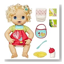 She can eat from a miniature bowl of special dolly food, drink from a magnetic sippy cup, close her eyes for a little nap, and say “I love you” to her “mommy.” She can also speak in 30 different, unique phrases, and makes real, messy (only wet) diapers for her miniature momma to change. Decked in an adorable dress, she’ll also fit in most typical baby doll clothes, so the options for wardrobe changes are limitless. |